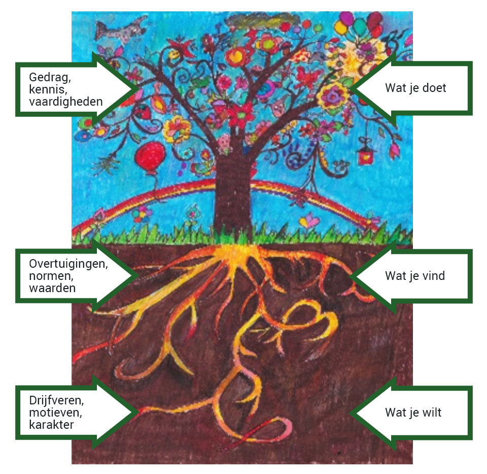 zorgen ervoor dat de boom stevig in de grond vast zit. Ook jij hebt wortels. De wortels zitten onder de grond en zijn verstopt onder een dikke laag grond. De wortels zijn rustig van kleur en zoeken onder andere hun weg naar voedsel. Hoe doe jij dit? (je ervaringen, overtuigingen, waarden, identiteit)